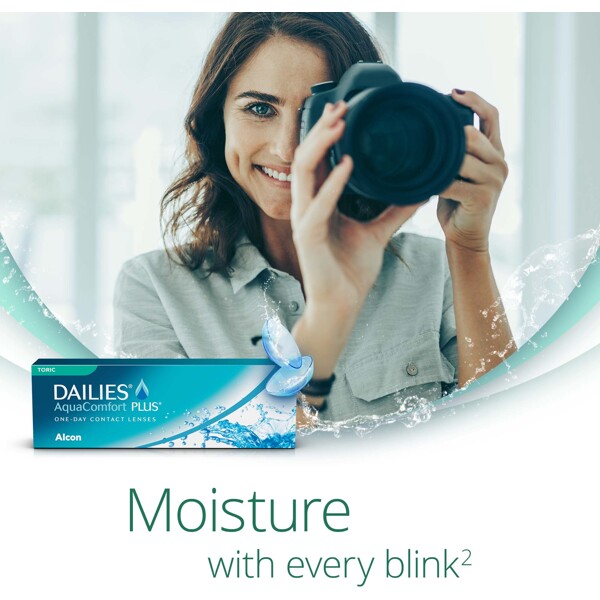 DAILIES AquaComfort PLUS TORIC Kontaktlinsen sind torische Eintageslinsen, die Astigmatismus korrigieren – für gleichmäßiges, scharfes und klares Sehen und erfrischenden Komfort den ganzen Tag lang. Durch 3 feuchtigkeitsspendende Inhaltsstoffe werden die Linsen bei jedem Lidschlag erfrischt und es entsteht ein ausgezeichneter Tragekomfort vom Einsetzen bis zum Herausnehmen der Linsen.