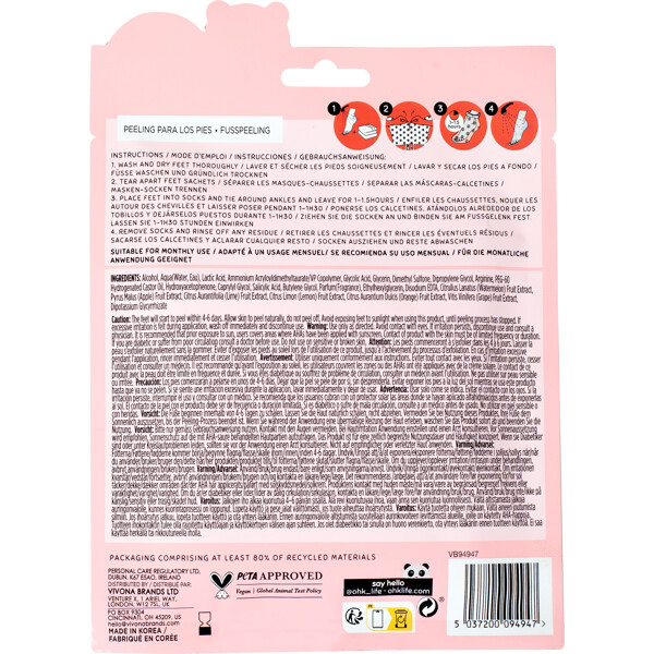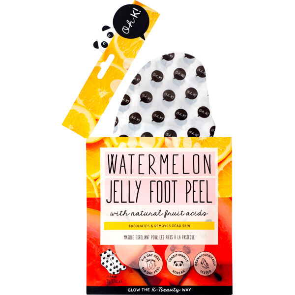 Oh K! Watermelon Jelly Foot Peel ist eine exfolierende Fußmaske, die Fruchtsäuren (AHAs & BHAs) enthält, welche die Haut sanft peelen und abgestorbene Hautzellen entfernen.