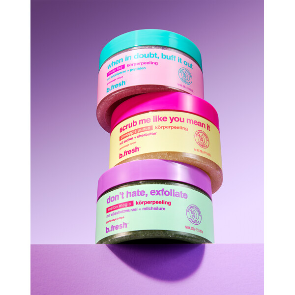 b.fresh Scrub Me Like You Mean It - Body Scrub ist ein sanftes Körperpeeling, das exfoliert und trockene sowie abgestorbene Hautzellen entfernt. Angereichert mit extra feinen Zuckerkristallen, die die Haut exfolieren, sowie feuchtigkeitsspendender Sheabutter, die die Haut weich und geschmeidig macht.
