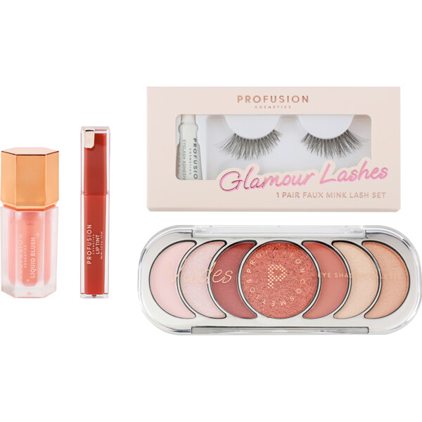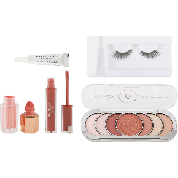 Es enthält ein flüssiges Rouge für natürliche Farbe, einen feuchtigkeitsspendenden Lip Tint mit leichter Farbe und Glanz, eine Lidschattenpalette mit 4 Nuancen für alles von dezenten Alltagslooks bis hin zu intensiven Abend-Make-up, sowie ein Paar falsche Wimpern mit transparentem Kleber für einfache Anwendung.