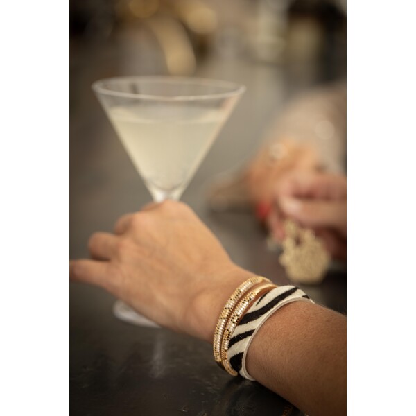 Ein 18K vergoldetes starres Armband mit von Hand gefassten Cubic-Zirkonia-Steinen, die das Licht fantastisch reflektieren. Die Steine sind klar, goldbraun und schwarz und bilden ein Leopardenmuster.