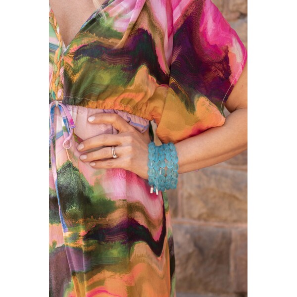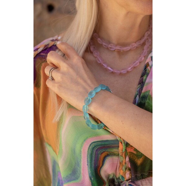 Ein elastisches Armband mit türkisfarbenen Glassteinen, die matt geschliffen sind und eine sanft abgerundete unregelmäßige Form haben.