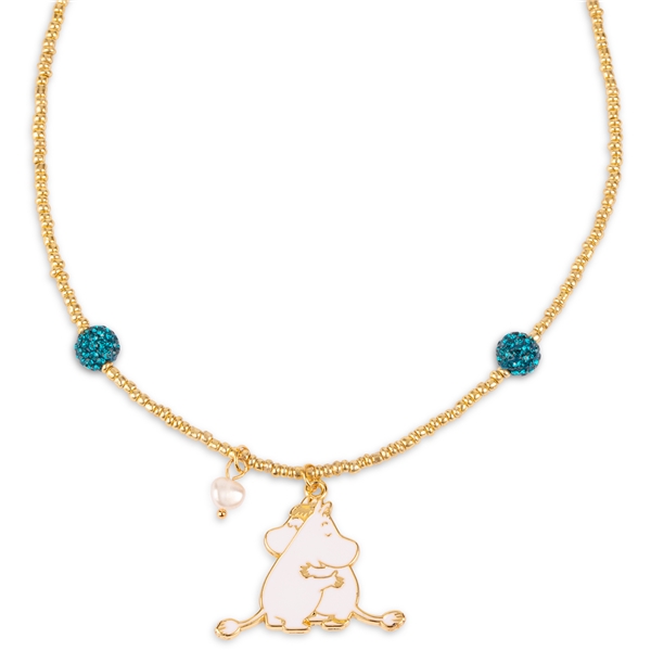 Ein handgefertigtes Kinderhalsband mit goldenen Glasperlen, zwei türkisen Glitzerkugeln und in der Mitte hängt eine echte weiße Süßwasserperle und eine handbemalte Mumin/Snorkfröken-Anhänger.