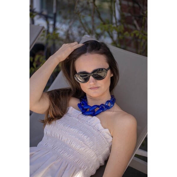 Eine blaue Harzhalskette mit 3 großen dunkelblauen Gliedern in der Mitte und an den Seiten durchsichtigen blauen Gliedern.