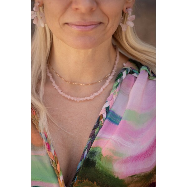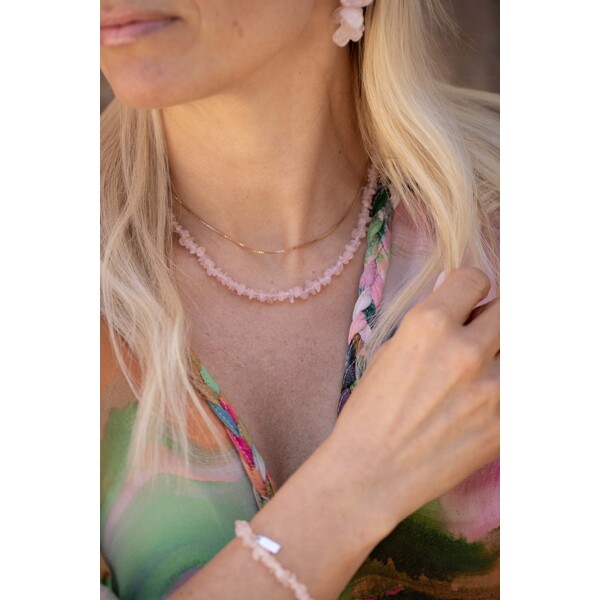 Eine coole Halskette mit kleinen rosa Rosenquarzsteinen.